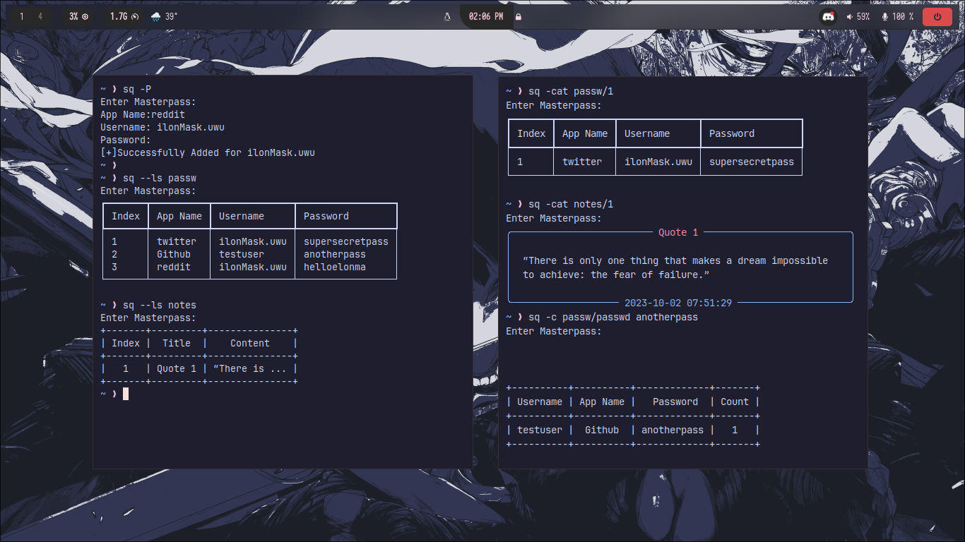 Fear not, my dear ladies and gentlemen! We are presenting you with SquarePass ,a military-grade offline password manager. With SquarePass, you can store your passwords, keys, and notes safely on your local machine. With the AES-256 encryption system of SquarePass, you don't have to worry about your privacy. Access your passwords from CLI with hints or directly copy them from the database to your clipboard. Now, you don't have to struggle with remembering countless passwords and pulling your hair out, or hiding them in a secret diary stashed away on some distant shelf. Square-pass simplifies your life, making it easier, more enjoyable, and stress-free.