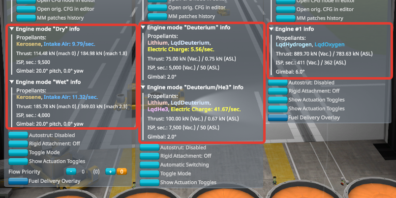 For engines, mod also display propellants information, thrust and ISP, minimum thrust (in %, and only if engine has non-zero minThrust) and engine gimbal information. If part has more than one ModuleEngines (for example, multi-mode engine like RAPIER), information for first two ModuleEngines will be displayed. RealFuels/RO, KSPIE and other engines are all supported.