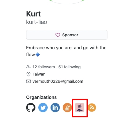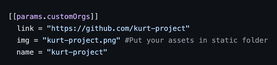 You may want to set some custom organizations except Github, Twitter, Facebook... Therefore, I've add the custom organization block for you to do so. The settings in config.toml might look like this: