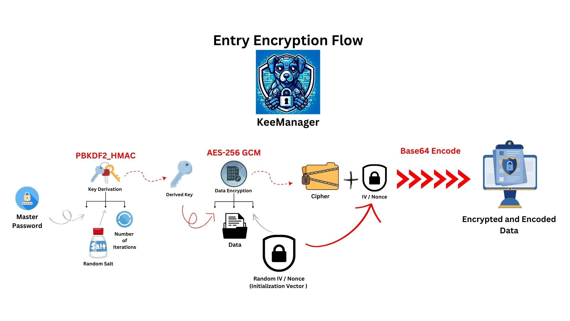 1. Key Derivation : A master password is securely processed using PBKDF2_HMAC.
