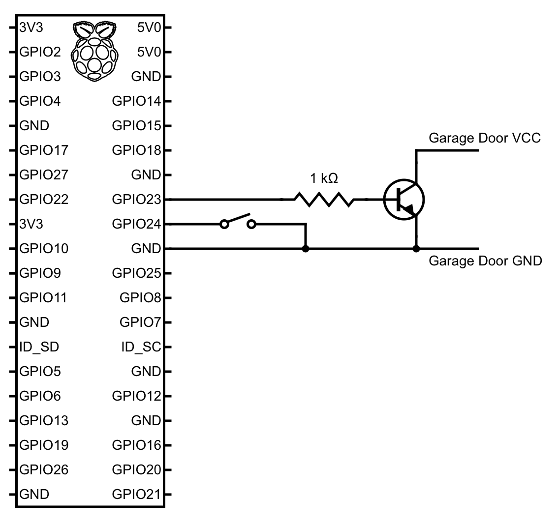 Using the transistor we can shortly short the 2 wires going into the garage door causing it to either open or close depending on the current position. If the garage door is either opening or closing, toggling it again causes it to stop wherever it is.