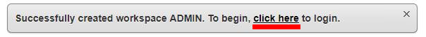 Una volta aver inserito i dati del nuovo utente, basta cliccare sul tasto Create Workspace e si verrà riportati alla home e vi sarà un avviso che ci informerà della possibilità di accedere alla workspace. E' necessario cliccare sul link indicato dall'immagine: