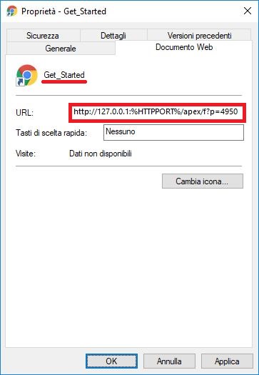 Verrà selezionato un file chiama Get_Started, bisogna accedere anche alle sue proprietà e selezionare il link contenuto nel campo URL e modificarlo da http://127.0.0.1:%HTTPPORT%/apex/f?p=4950 in http://127.0.0.1:8080/apex/f?p=4950: