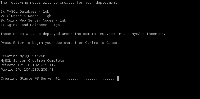 This script will create a scalable Wordpress deployment consisting of a MySQL server, multiple GlusterFS nodes, multiple nginx web server nodes and an Nginx load balancer using the DigitalOcean API, user-data and droplet meta-data.