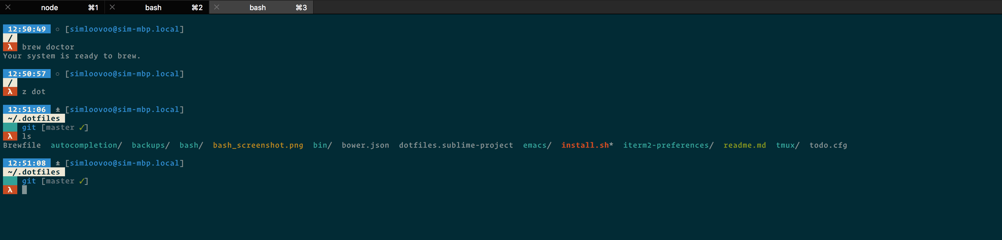 I started my customization journey with bash-it, an obvious choice given my predisposition for bash (see footnote). Bash-It is a "shameless rippoff of oh-my-zsh" that provides a framework for including aliases, plugins, completions, and themes in your configuration. I combed through the files and picked out several features I wanted to keep and use as my own.
