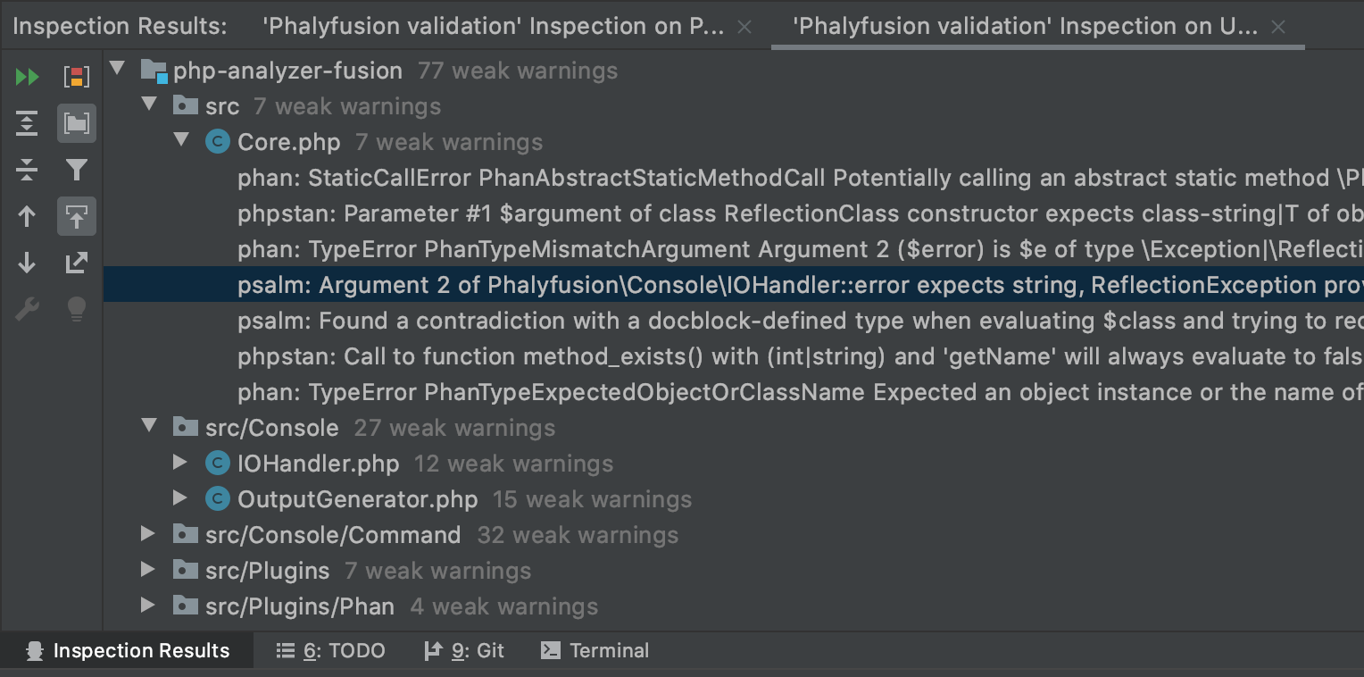 - Enable inspections "Phalyfusion global validation" and "Phalyfusion on-fly validation" in "Preferences | Editor | Inspections | PHP | Quality tools" to be able to launch Phalyfusion via plugin.
