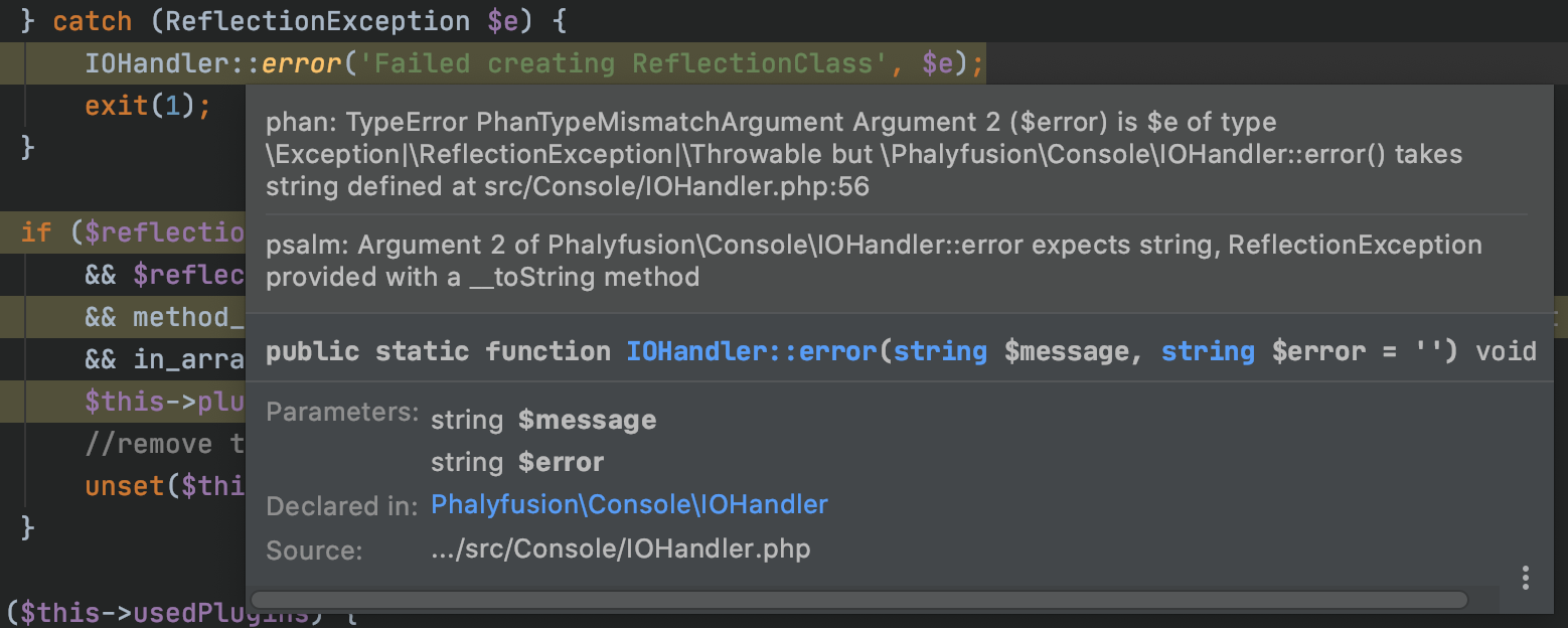 - Enable "Launch Phalyfusion in on-fly mode" setting in "Preferences | Language & Frameworks | PHP | Quality Tools | Phalyfusion | Configuration" for instant analysis of the current file and error highlighting