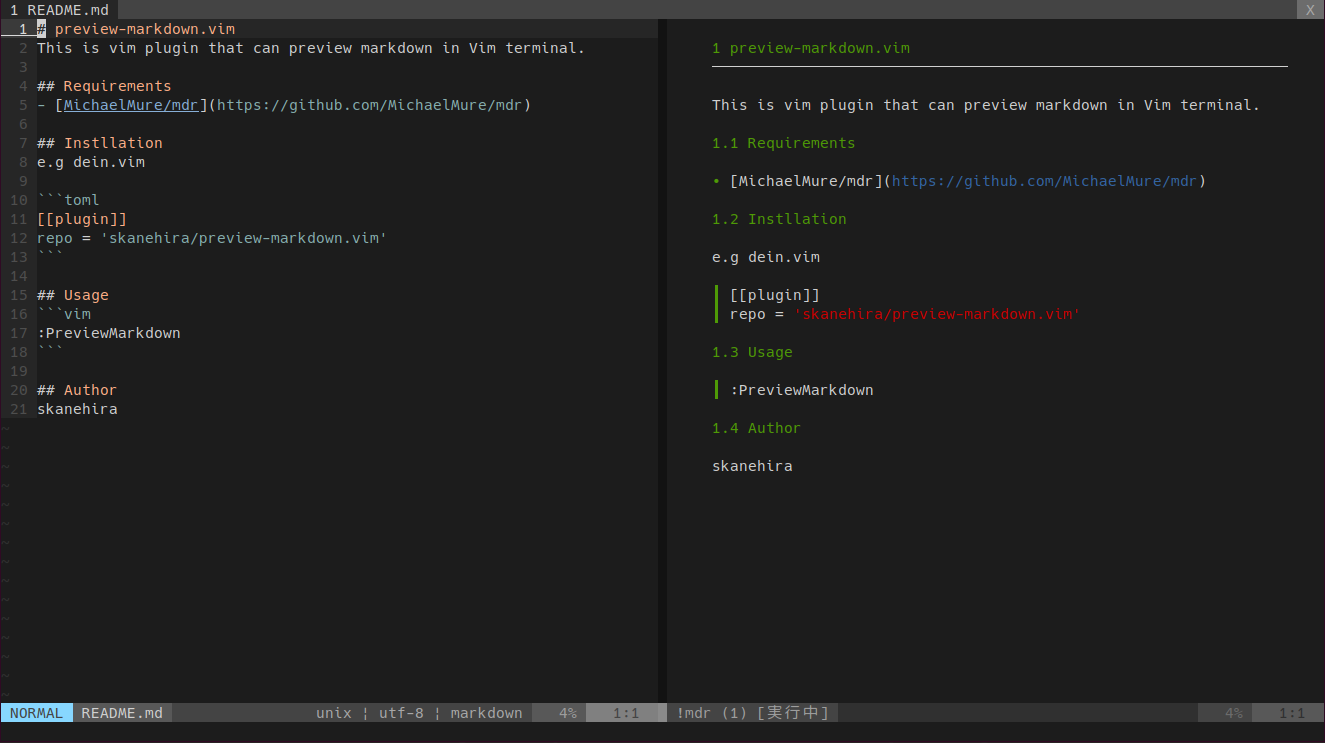 repo = 'skanehira/preview-markdown.vim':PreviewMarkdown [left|top|right|bottom|tab]| option | description |
