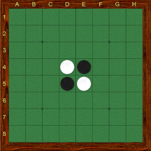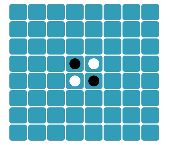 Cada jogador fica com 32 discos e escolhe uma cor para usar durante a partida. Nas posições do preto são colocados dois discos pretos e nas posições do branco, dois discos brancos como mostra a figura 1.