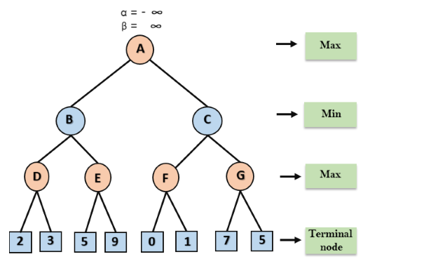 Etapa 1: Na primeira etapa, o algoritmo gera toda a árvore do jogo e aplica a função de utilidade para obter os valores de utilidade para os estados terminais. No diagrama de árvore abaixo, vamos considerar que A é o estado inicial da árvore. Suponha que o maximizador dê o primeiro turno, que tem o valor inicial do pior caso = - infinito, e o minimizador dê o próximo turno, que tem o valor inicial do pior caso = + infinito.