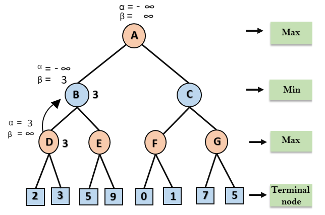 Etapa 3: Agora o algoritmo retrocede para o nó B, onde o valor de β mudará, pois esta é uma volta de Min, agora β = + ∞, irá comparar com o valor dos nós subsequentes disponíveis, ou seja, min (∞, 3) = 3, portanto, no nó B agora α = -∞ e β = 3.