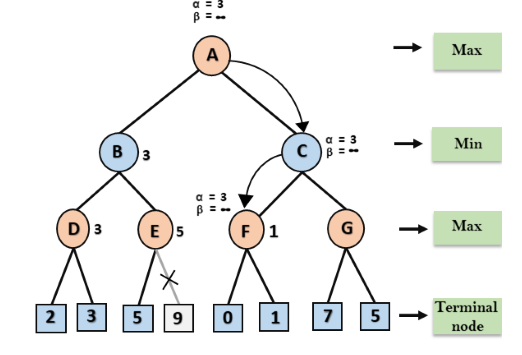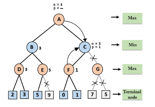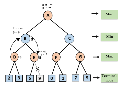 - Durante o retrocesso da árvore, os valores dos nós serão passados para os nós superiores em vez dos valores de alfa e beta.