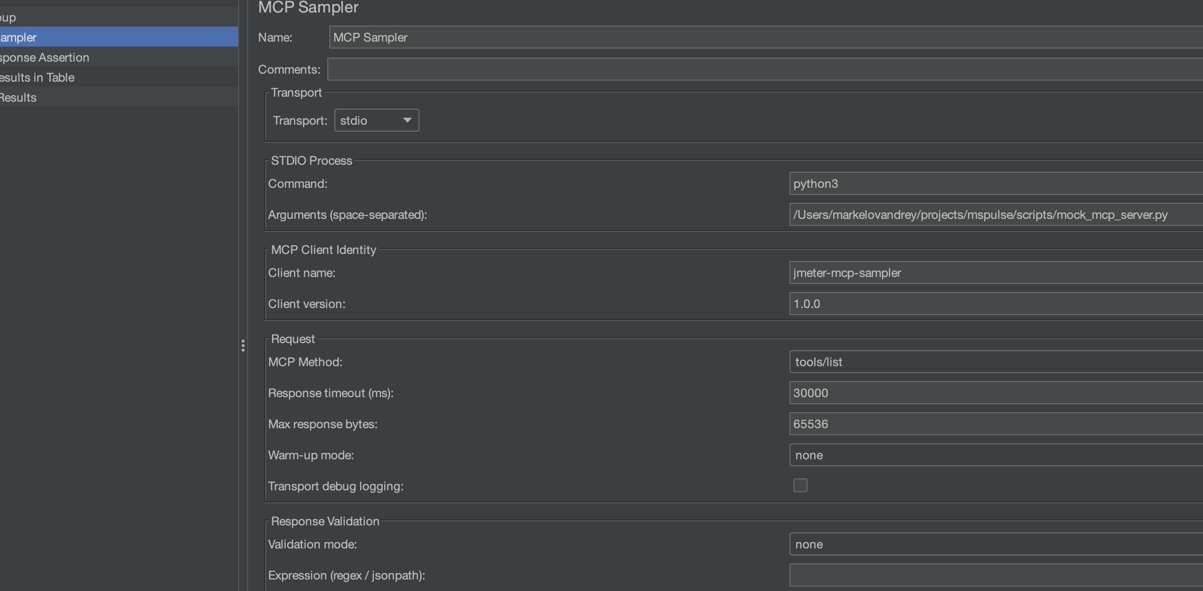 1.0.1https://github.com/AndreyVMarkelov/MCPulse/releases/download/v1.0.1/jmeter-mcp-sampler-1.0.1.jarjackson-databind 2.17.1jackson-core 2.17.1jackson-annotations 2.17.1Screenshot