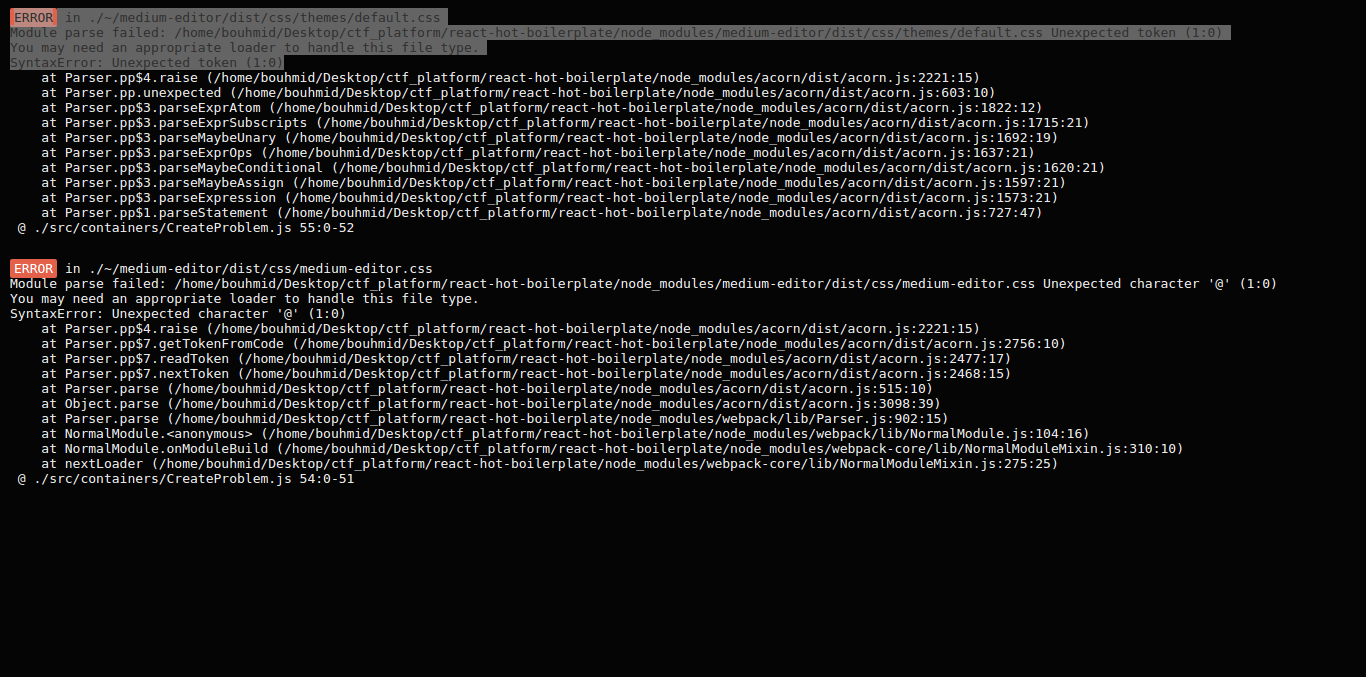 ERROR in ./~/medium-editor/dist/css/themes/default.css Module parse failed: /home/bouhmid/Desktop/ctf_platform/react-hot-boilerplate/node_modules/medium-editor/dist/css/themes/default.css Unexpected token (1:0) You may need an appropriate loader to handle this file type. SyntaxError: Unexpected token (1:0) #73